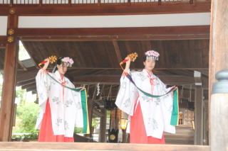 令和6年10月14日例祭当日の本殿祭では巫女の「浦安の舞」が奉納されました。地元の高校生2名が夏から稽古に励んで、立派に舞を奉納してくれました。 |