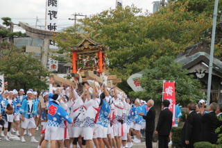 令和4年10月10日撮影3年ぶりの御旅巡幸です。2基の御神輿のうち、先に進む日子坐王の御神輿を今年の還暦者が曳き、後ろの住吉大神・水之江浦嶋子神の御神輿を今年の42歳が曳きます。 42歳の御神輿は令和元年まで担いでいたのですが、今年は人数が少なくなったために台車に載せて曳くこととなりました。 しかし、42歳の皆さんから「やはり初老の記念に担ぎたい」との申し出があり、神社の門前の交差点から拝殿前まで賑やかに担いでくれました。 |