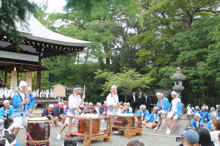 令和5年7月24日 愛宕神社例祭 マンドリ神事例祭の後は、網野神社の拝殿前に場所を移し、網野神楽保存会の「御神楽」、網野太鼓の勇壮な太鼓の奉奏を鑑賞し、引き続き12名の方にマンドリを奉納していただきました。今年は4年ぶりに住吉区青年部の模擬店が出て、ようやく完全な形での愛宕祭の斎行となりました。 24日は平日だったにもかかわらず、多くの参拝者が詰めかけました。 |